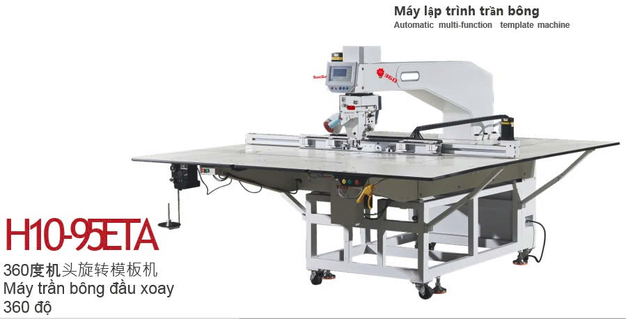 Máy may lập trình chần bông khổ lớn đầu xoay 360 độ Sunsir H10-95ETA là dòng máy may lập trình khổ lớn dùng để may chần bông trong nghành may, chăn ga gối đệm, nội thất ô tô… Sử dụng công nghệ đầu xoay 360 độ không đứt chỉ.